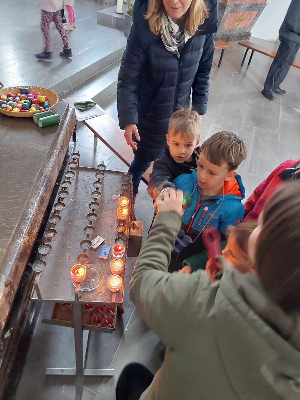 Ein Blick durch das selbstgebastelte Fernrohr und dann ging es los auf Entdeckungstour durch die Kirche. In Gruppen besuchten die Kinder die verschiedensten Stationen. Die Sakristei wurde von Dietmar Hirschbühl erklärt, Pfarrer Ratz ließ die Augen beim neuen Taufbecken, der Osterkerze sowie dem Altar strahlen. Sandra stimmte mit den Kindern die Orgel an und mit Anna wurden bei den Opferkerzen Wünsche zu Gott gesendet und den Beichtstuhl begutachtet. Zum Abschluss durften die Erstkommunionskinder noch den Kirchturm erklimmen.